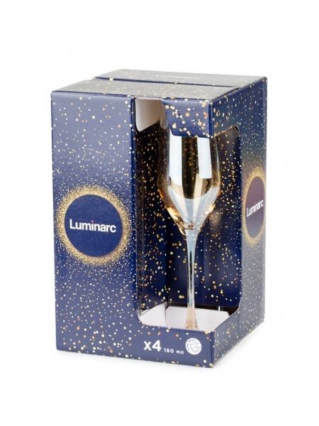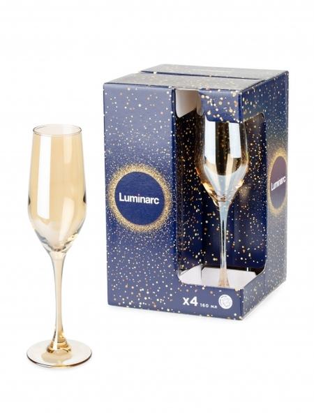 Набор бокалов для шампанского на ножке Золотой мед. Бокалы стеклянные станут изюминкой вашего стола. Золотой цвет подчеркивает красоту и филигранность бокалов. Набор бокалов состоит из 4 штук объемом 160 мл. Набор Luminarc изготовлен из высококачественного закаленного ударопрочного стекла, которое устойчиво к появлению царапин, внешним повреждениям и перепадам температур. Стекло не мутнеет со временем, сохраняет первоначальный блеск и не выделяет вредных веществ. Бокалы универсальные стеклянные можно подарить на Новый год, Рождество, 23 февраля, 8 марта и другие праздники. Бокалы для шампанского незаменимы на любом празднике. Уют и стиль для вашего дома!
